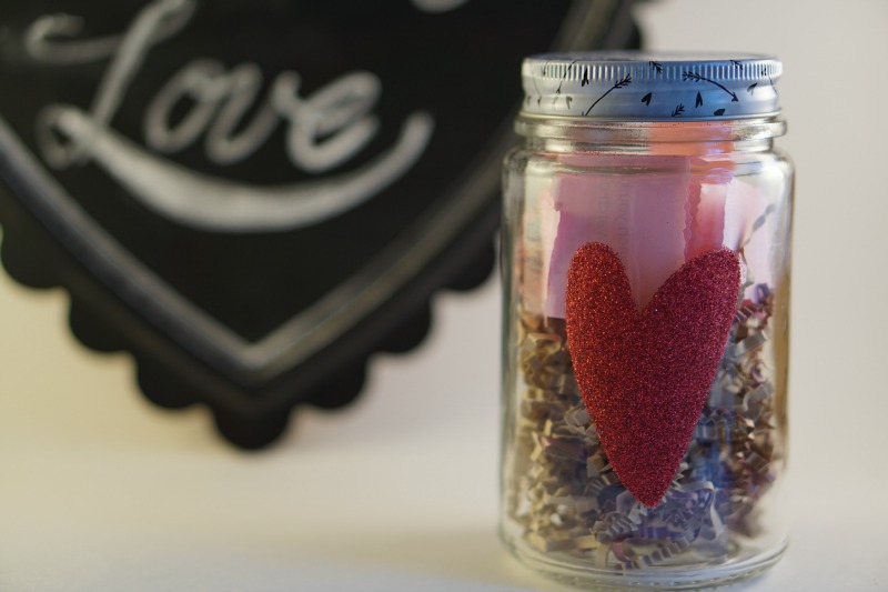 This year, while strolling {okay, stalking} the $1.00 aisle at Target, glass jars with sparkly hearts spoke to me. I didn’t exactly know what I would do with them, but that didn’t stop me from buying several.