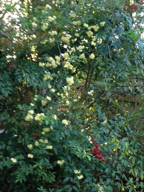 Lady Banks Rose growing over my Nandina bush.